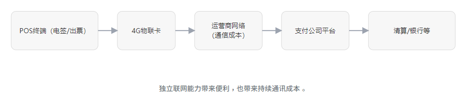 为何早期蓝牙POS多不收流量费?因为它依赖手机蓝牙功能;而独立联网的电签/大POS内置流量卡,通讯与硬件都是实打实的成本。POS终端(电签/出票)4G物联卡运营商网络(通信成本)支付公司平台清算/银行等独立联网能力带来便利,也带来持续通讯成本。